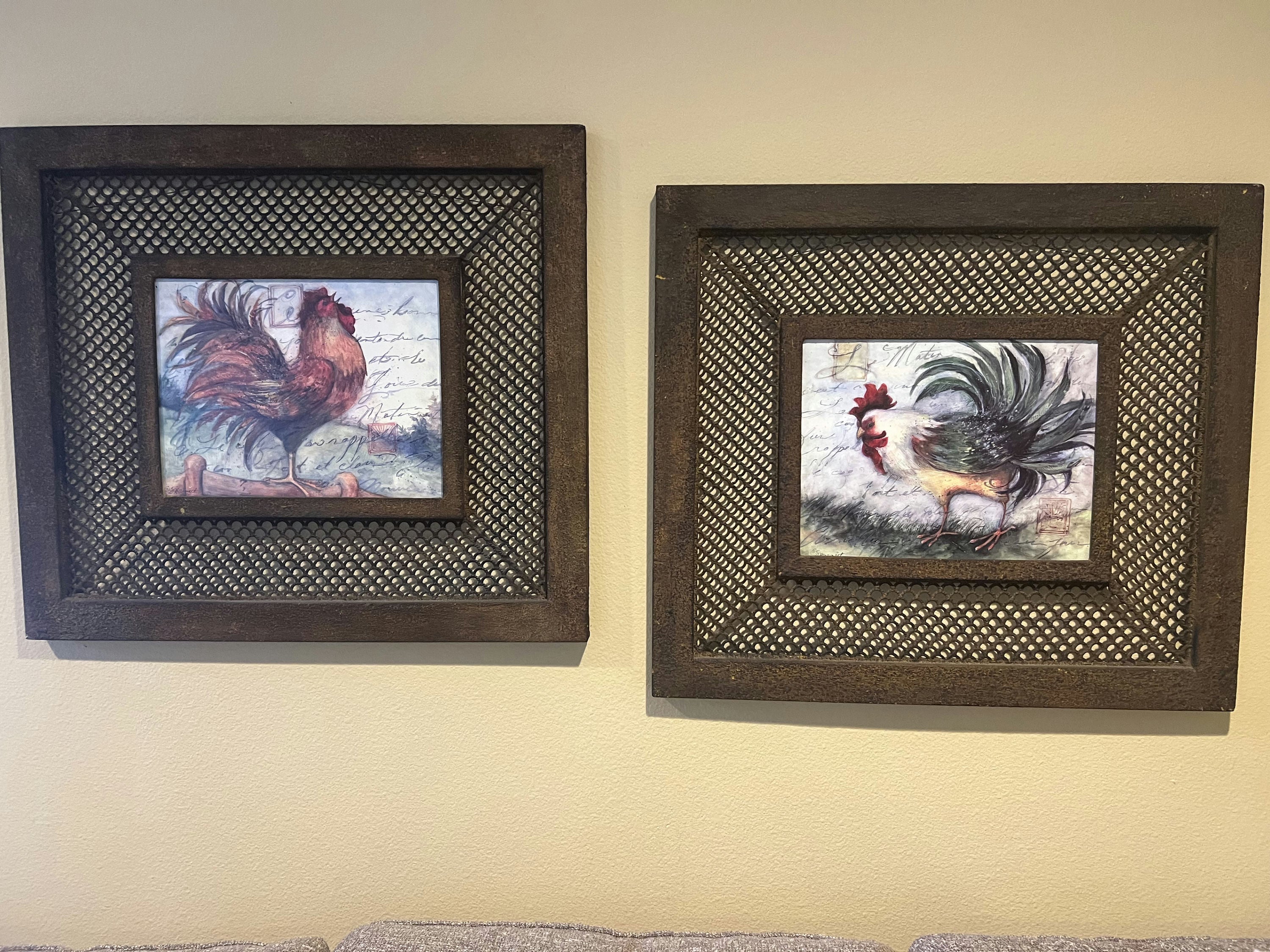 Enhance your home decor with these charming rooster prints beautifully displayed in iron mesh frames. Each piece features vibrant artwork that adds a rustic yet stylish touch, making them perfect for any kitchen or dining area. These prints not only celebrate the beauty of farm life but also serve as captivating conversation starters for your guests. Key Points: - Set of two rooster prints. - Elegant iron mesh frames. - Ideal for kitchens or dining areas. Dimensions: 28"W X 25"H