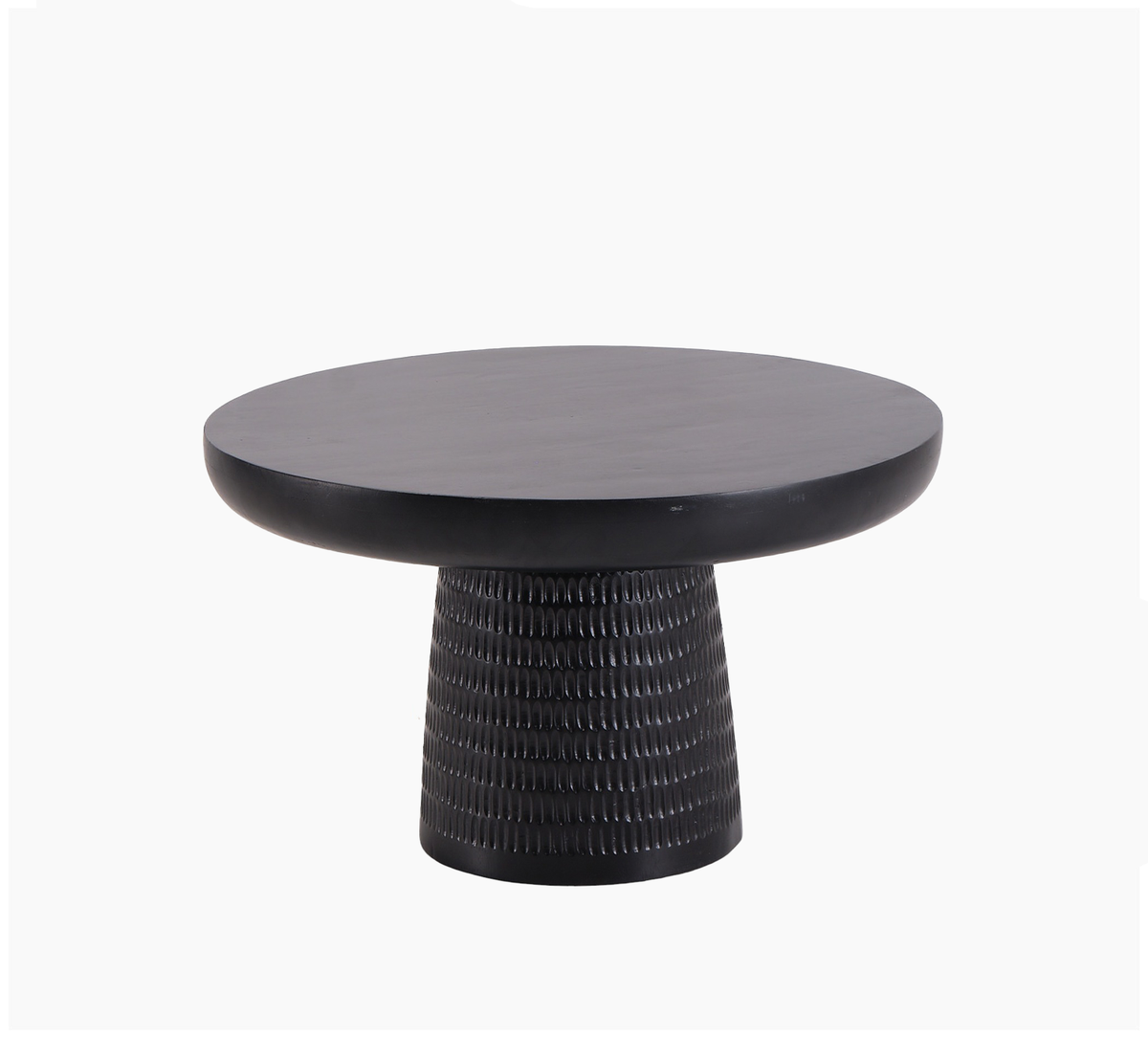 Constructed of solid mango wood with a thick round top and bell shape base in a black finish. The top and base of the table are made of kiln dried 100% natural solid wood with hand chiseling on the base. The product has water resistant lacquer coating.