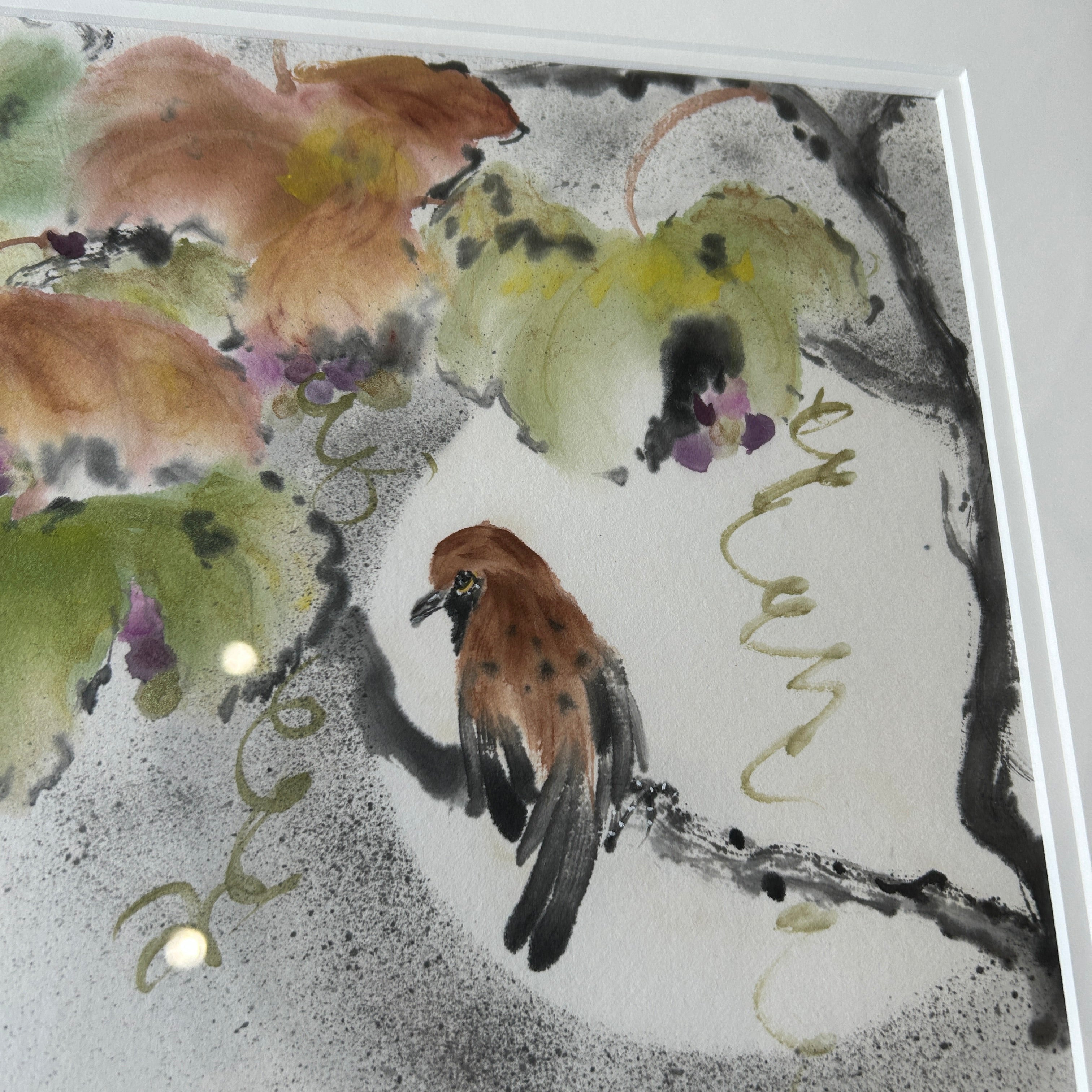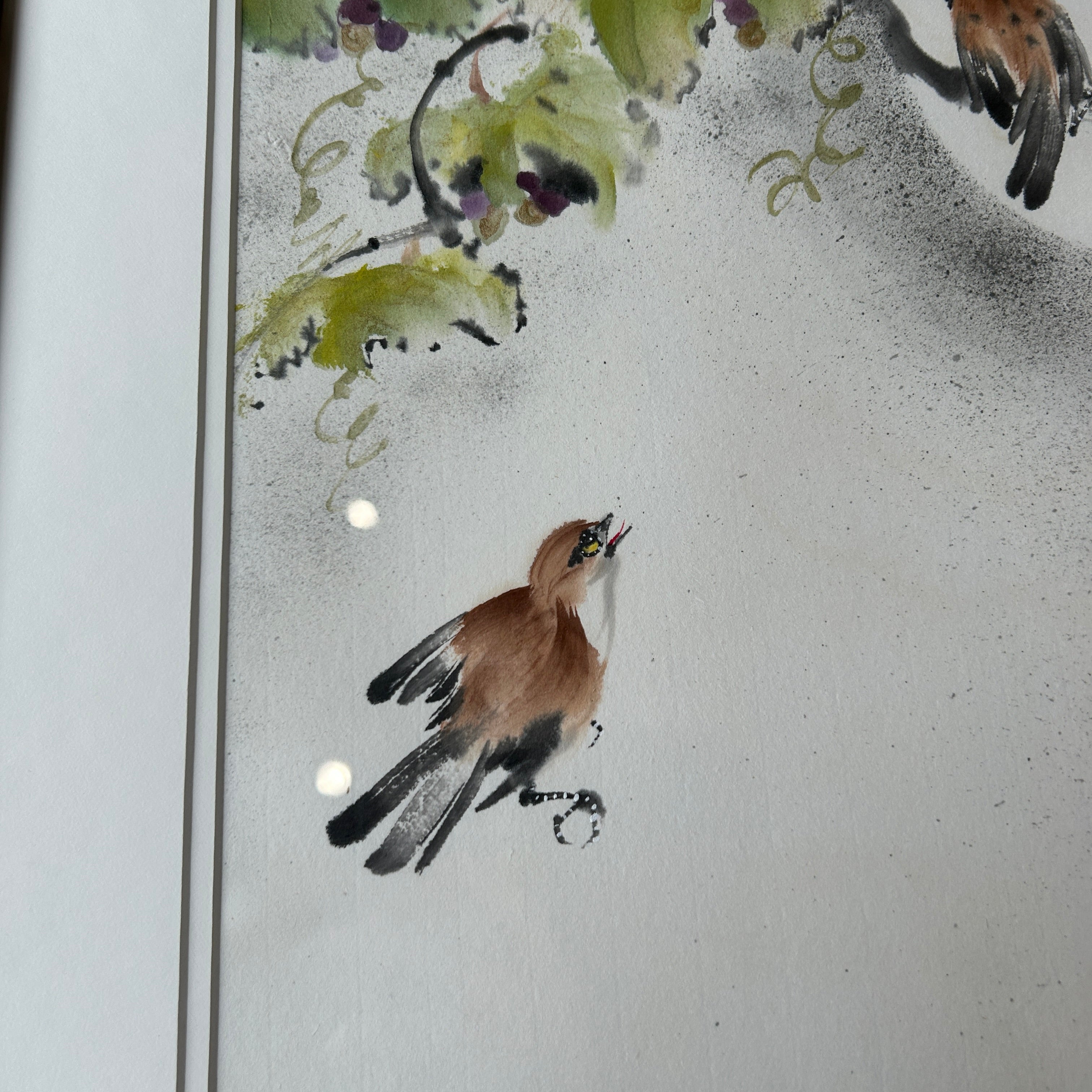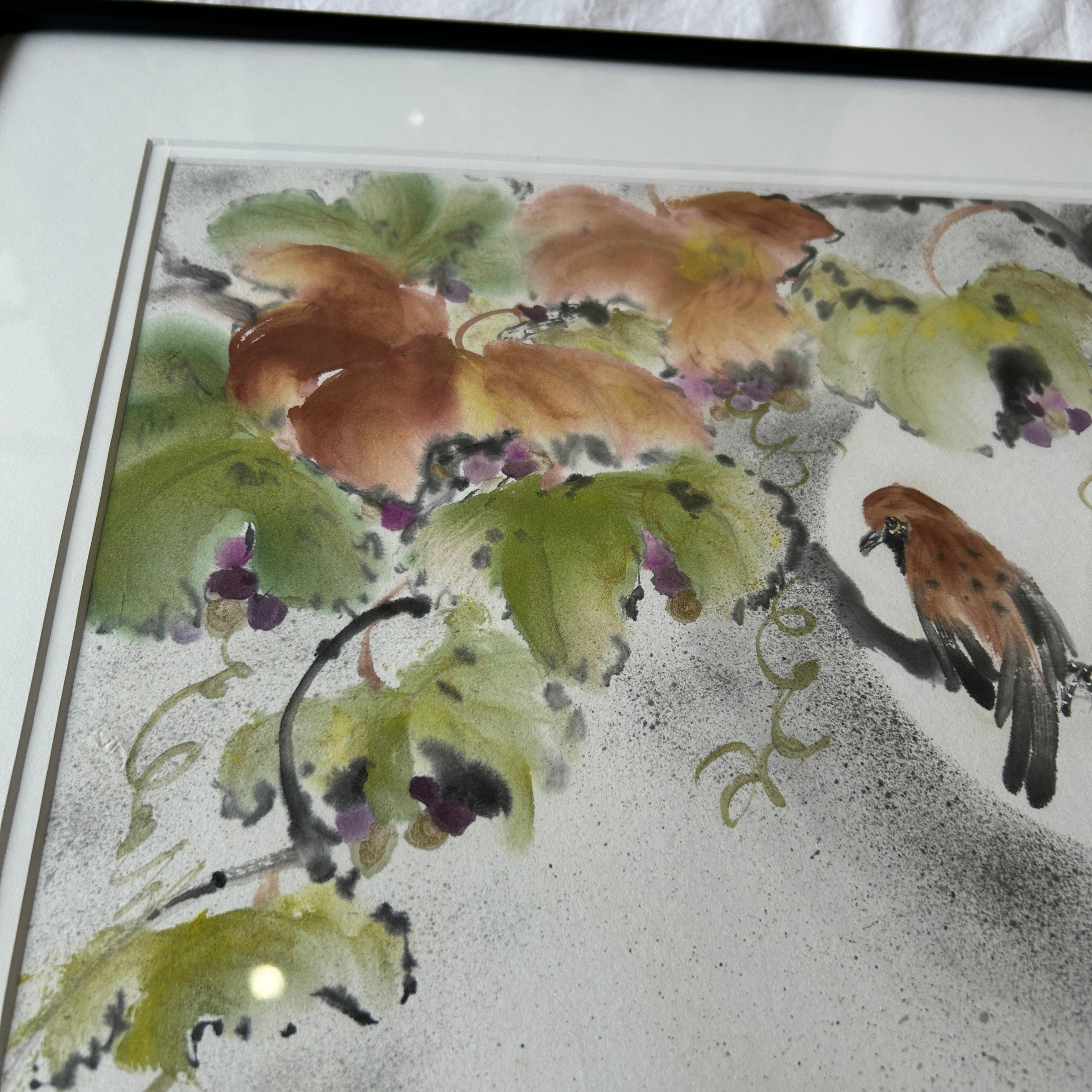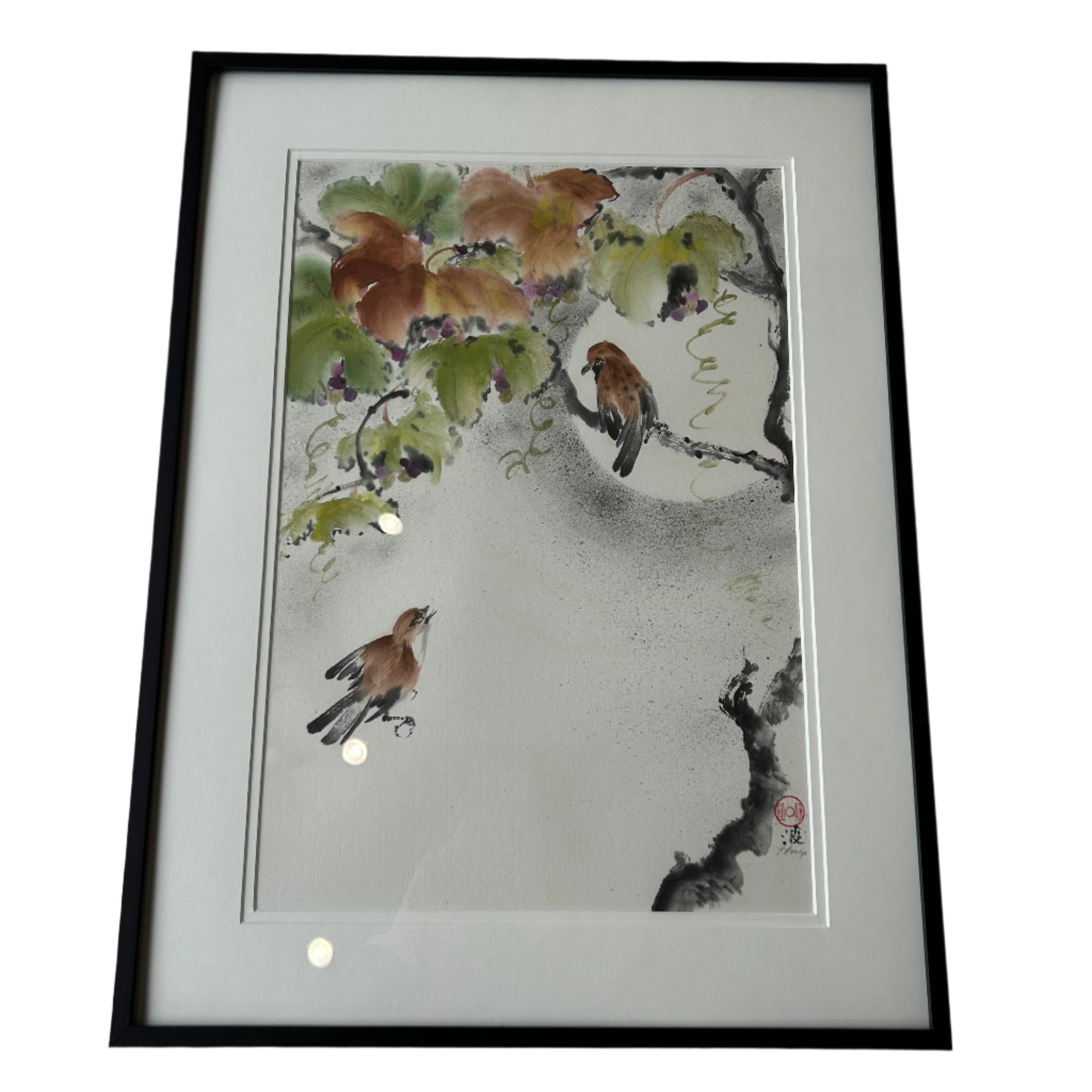 Signed Original Sumi "Birds and Wisterias" by Patricia Bruzas 18" L x 24" H