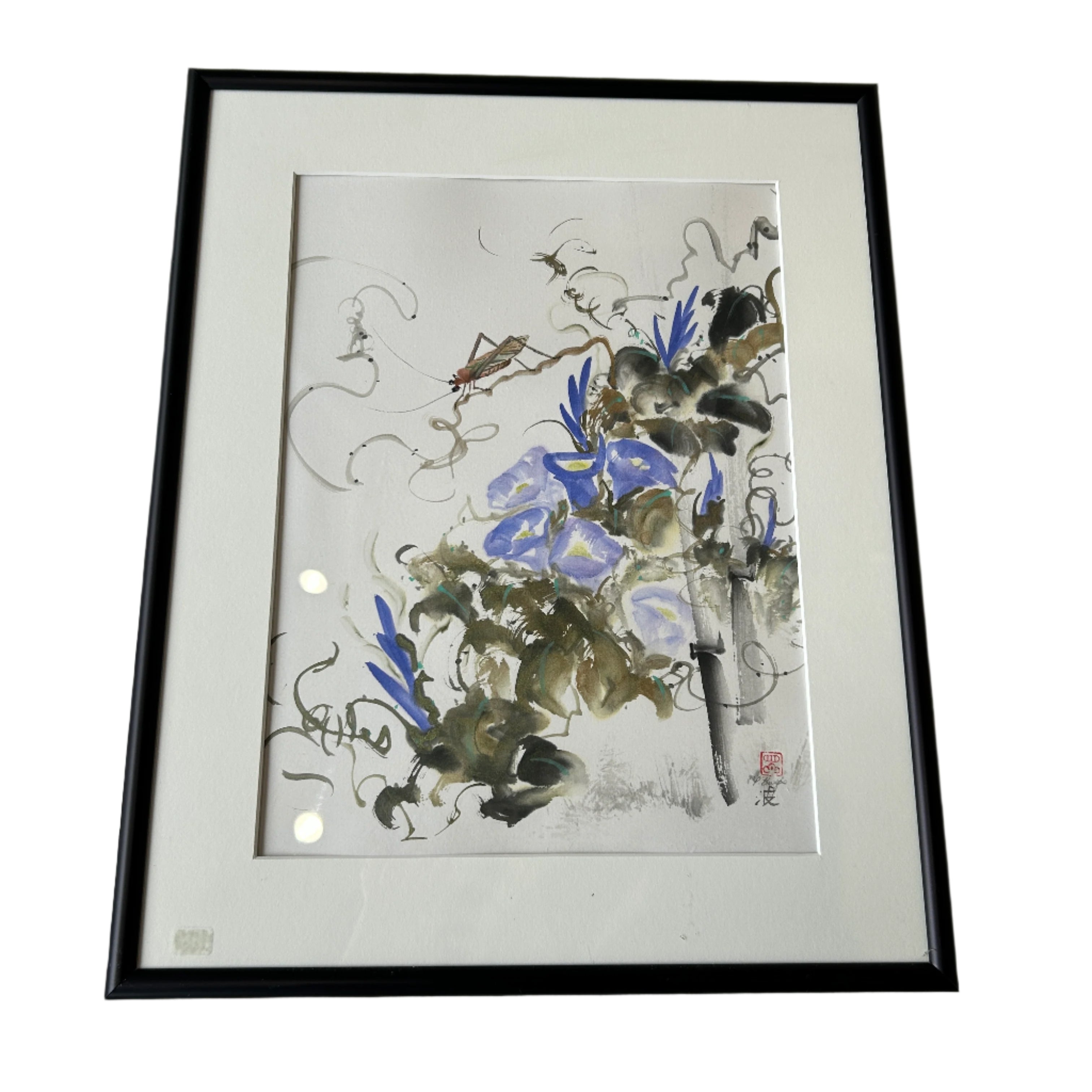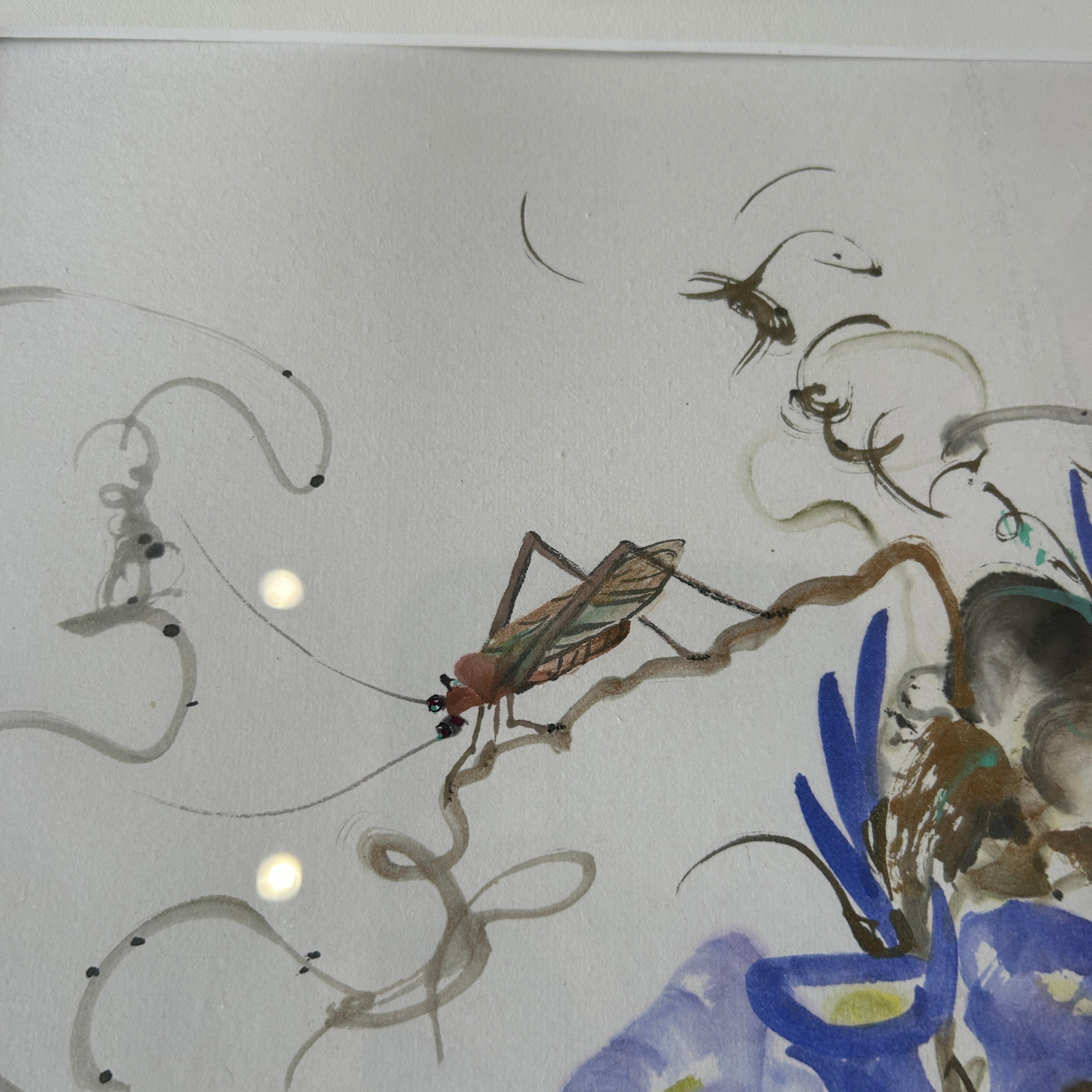 Grasshopper on purple flowers with black frame – a unique piece of original art, perfect for adding a distinctive touch to your space.