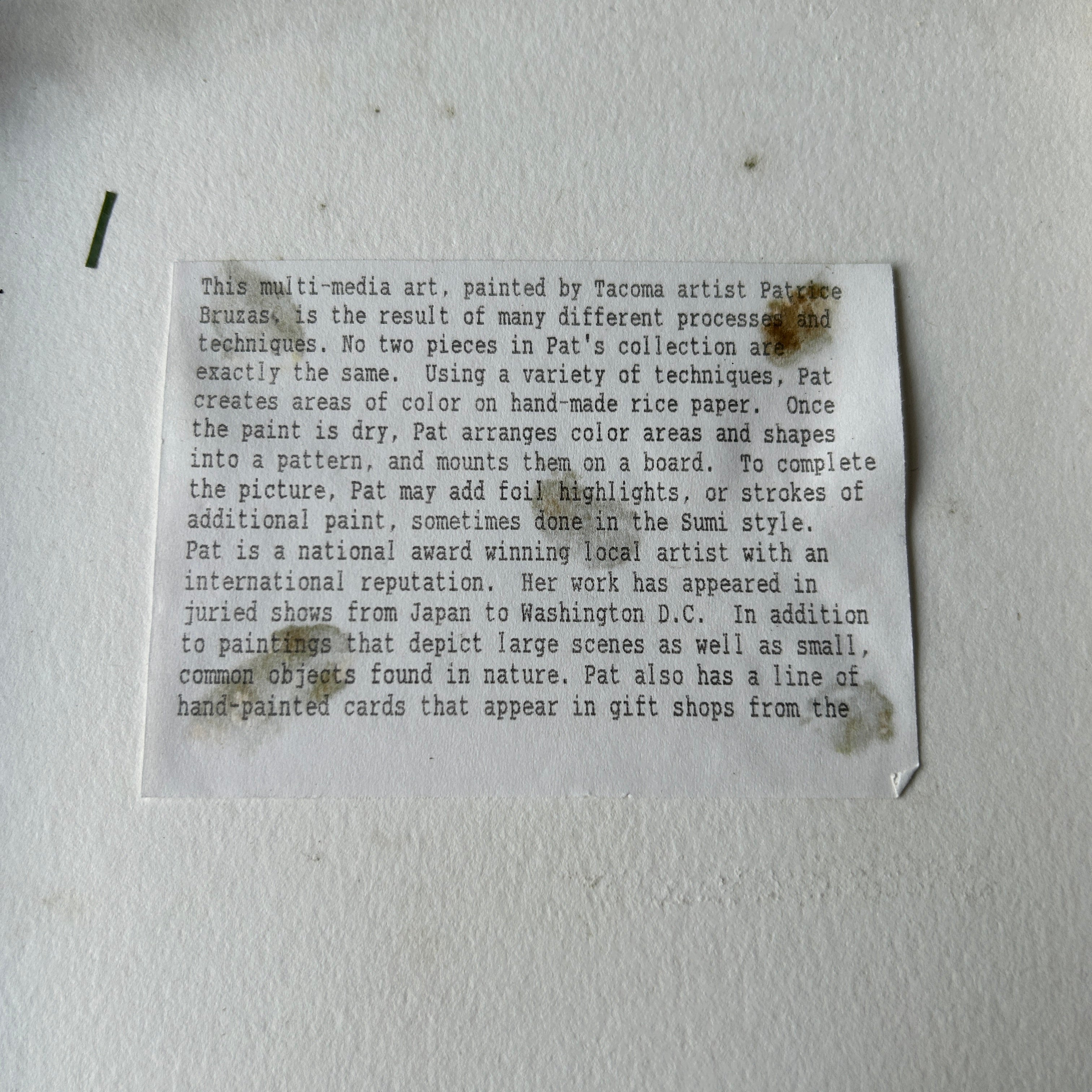 After a career in design, Patrice found a calling as a Sumi artist. She then changed paths to teach beginning and continuing Sumi-e painting at Tacoma Community College as well as taught many Sumi-e and Collage workshops throughout Washington State. Patrice has also been an instructor for Seniors Making
