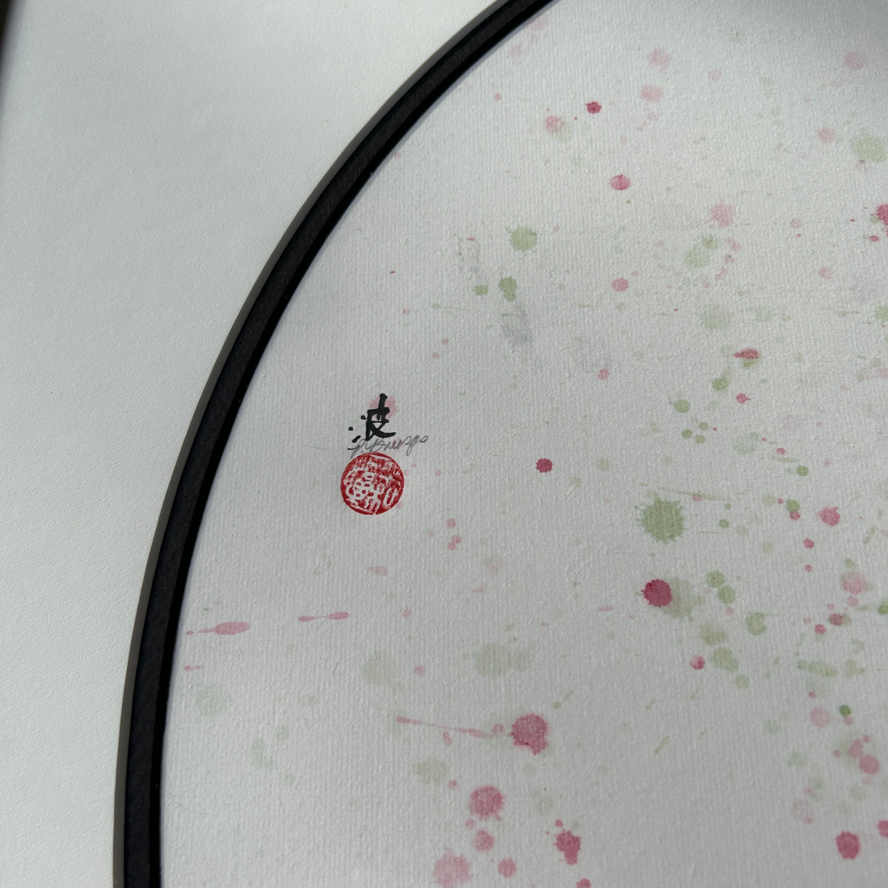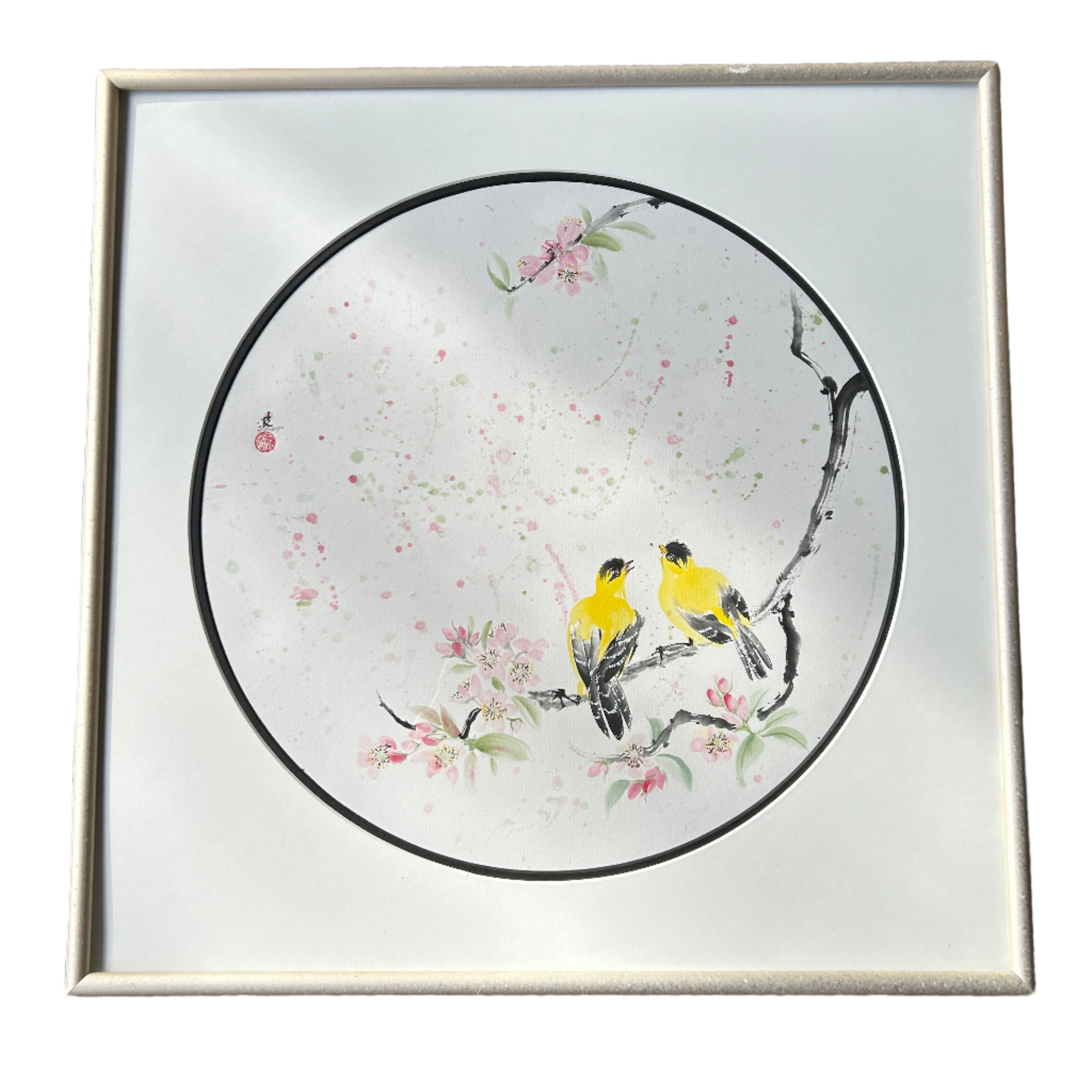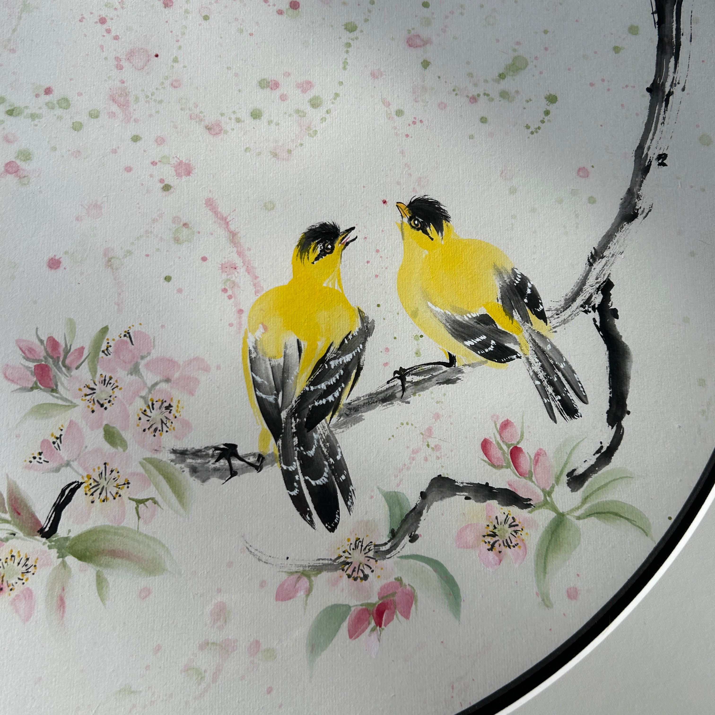 Signed Original Sumi "Spring Beauties (Apple Blossom & Goldfinch" by Patricia Bruzas 25" L x 25" H