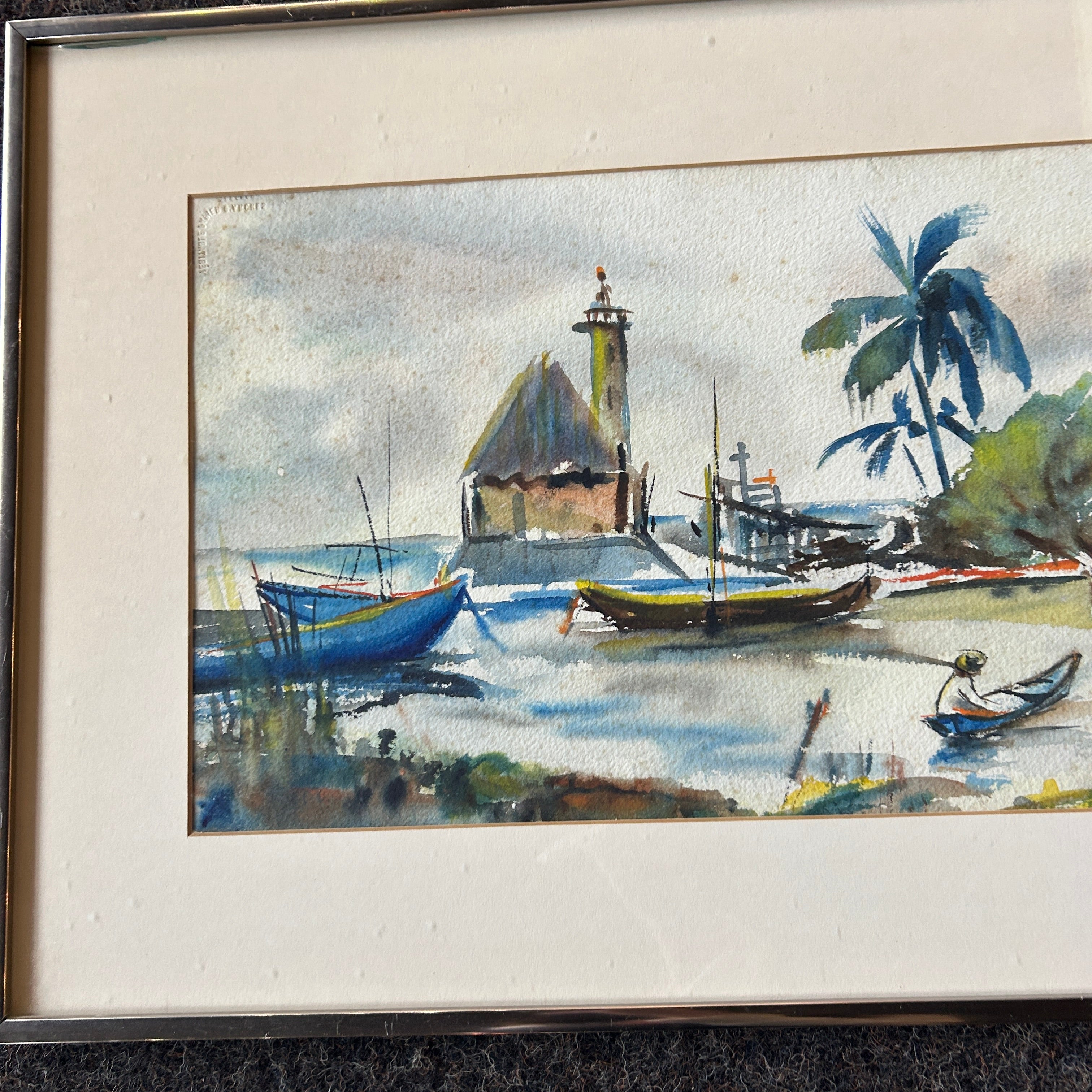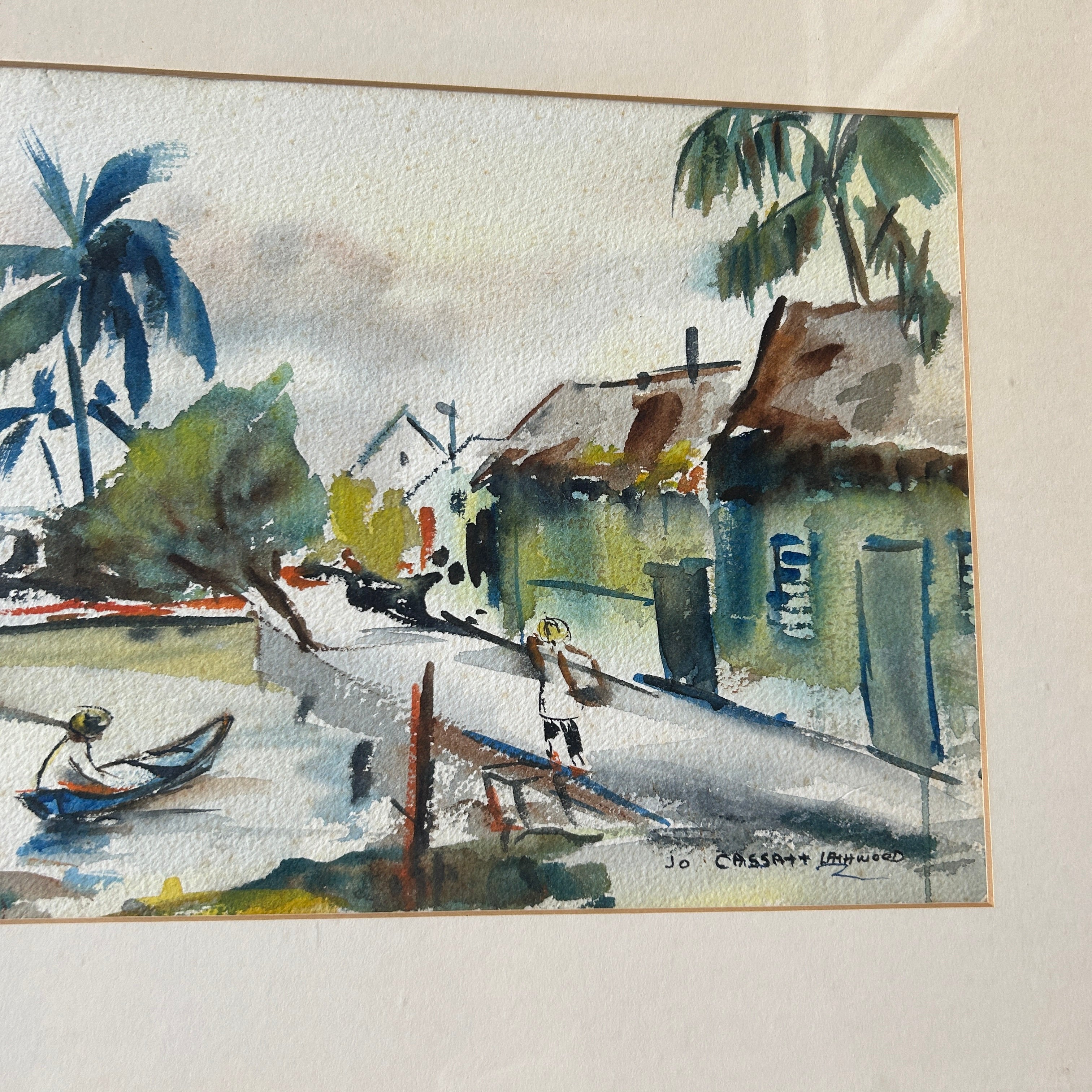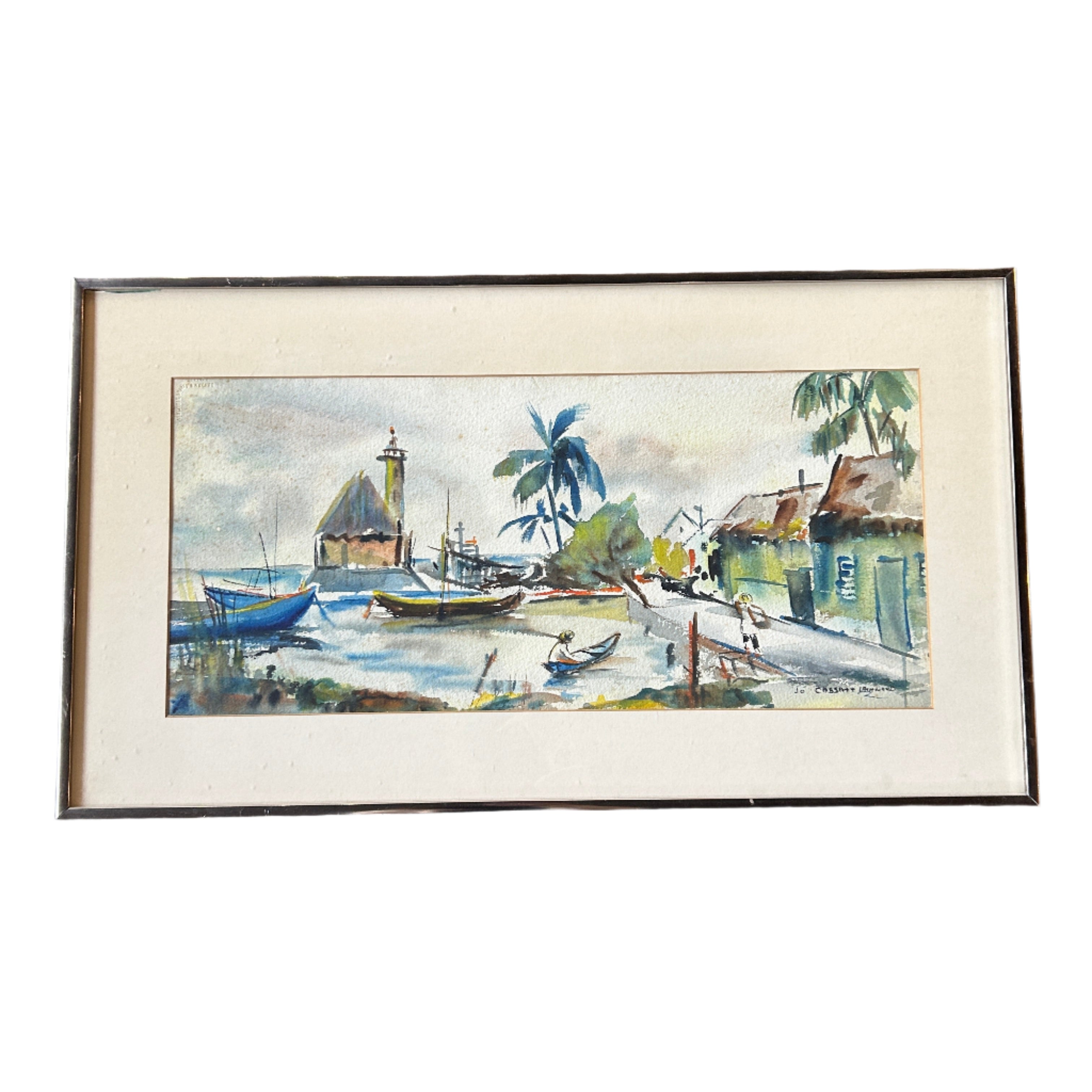 Immerse yourself in the charm of coastal village life with this original watercolor painting by Jo Cassett Lathwood. Featuring vibrant boats bobbing in a serene harbor, palm trees swaying in the breeze, and rustic thatched-roof homes lining a quiet shoreline, this piece captures a moment of tropical tranquility. Measuring 28 inches wide by 16 inches high and framed with a classic neutral matte and slim border, it brings warmth and character to any space.