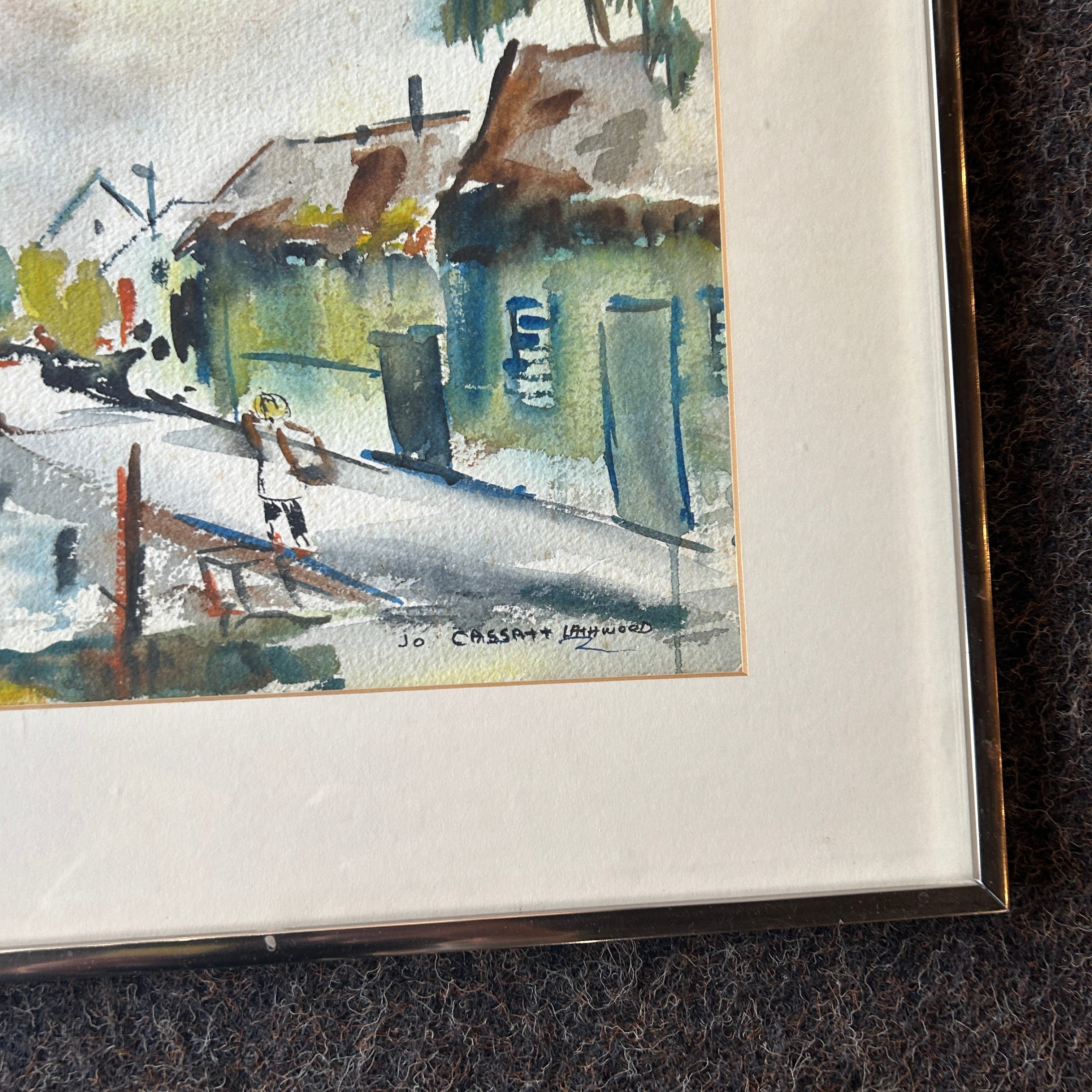California artist Jo Lathwood (1938-1973). Jo Lathwood was Mary Cassatt's niece. Jo Lathwood established a custom boutique at Malibu Beach in 1938. She gained fame as a designer of the first bikinis and other sportswear for Saks, Neiman Marcus, and members of the film colony. An inveterate traveler, she made trips each year to the South Pacific where she painted many watercolors of the native people and their activities. She died in Santa Monica on August 20, 1987.