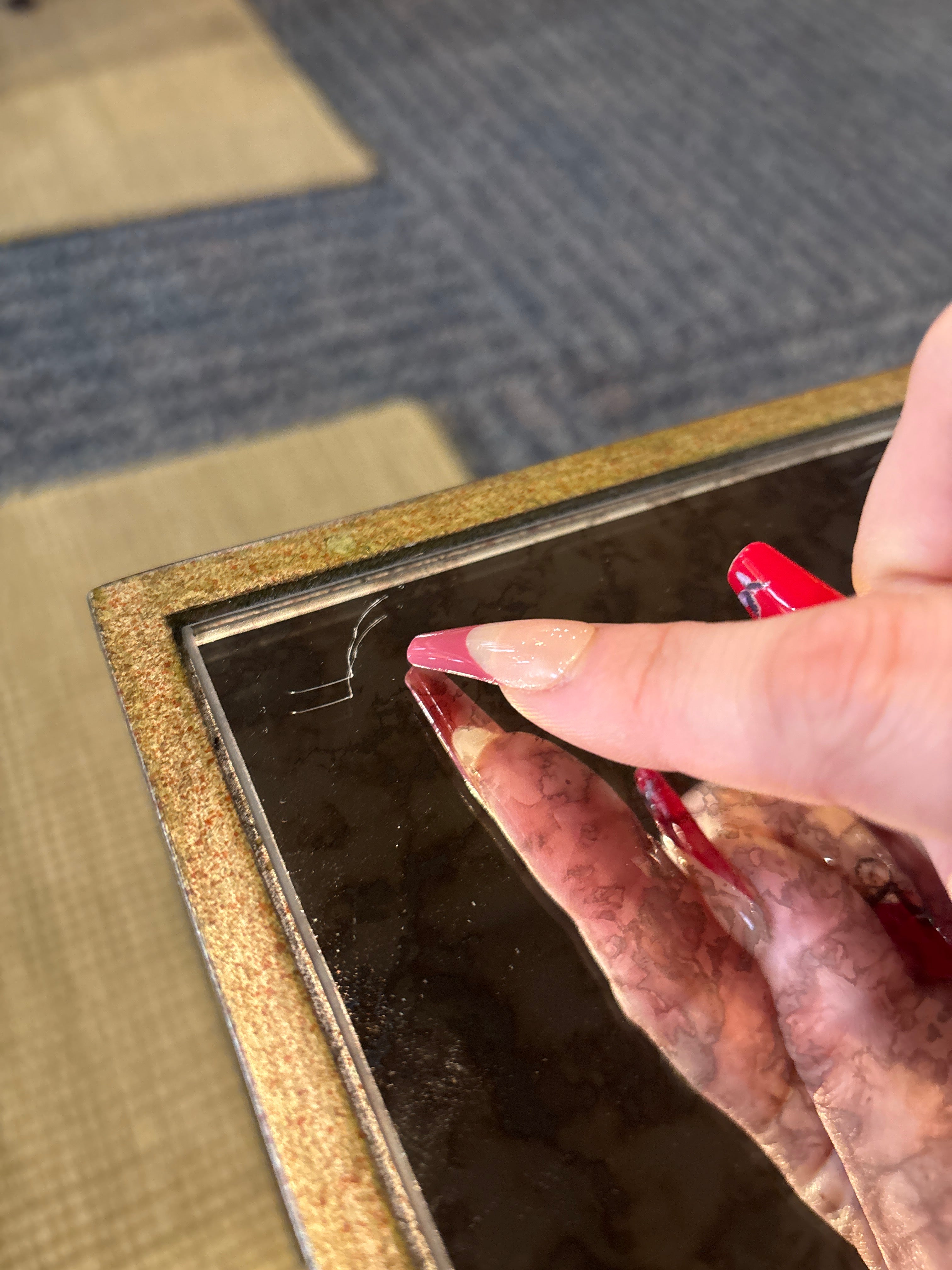 Simplistic elegance displayed in a thinly trimmed frame, finished in a burnished antique gold on birch wood, outlining every side with rich mottled antique mirror. Small scratches on surface, see photos.