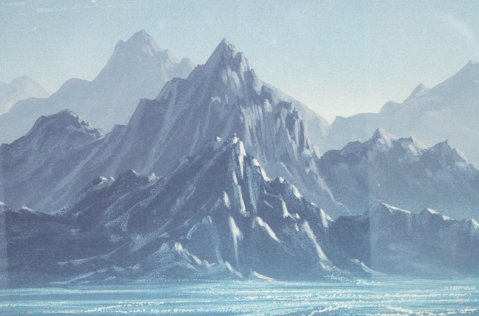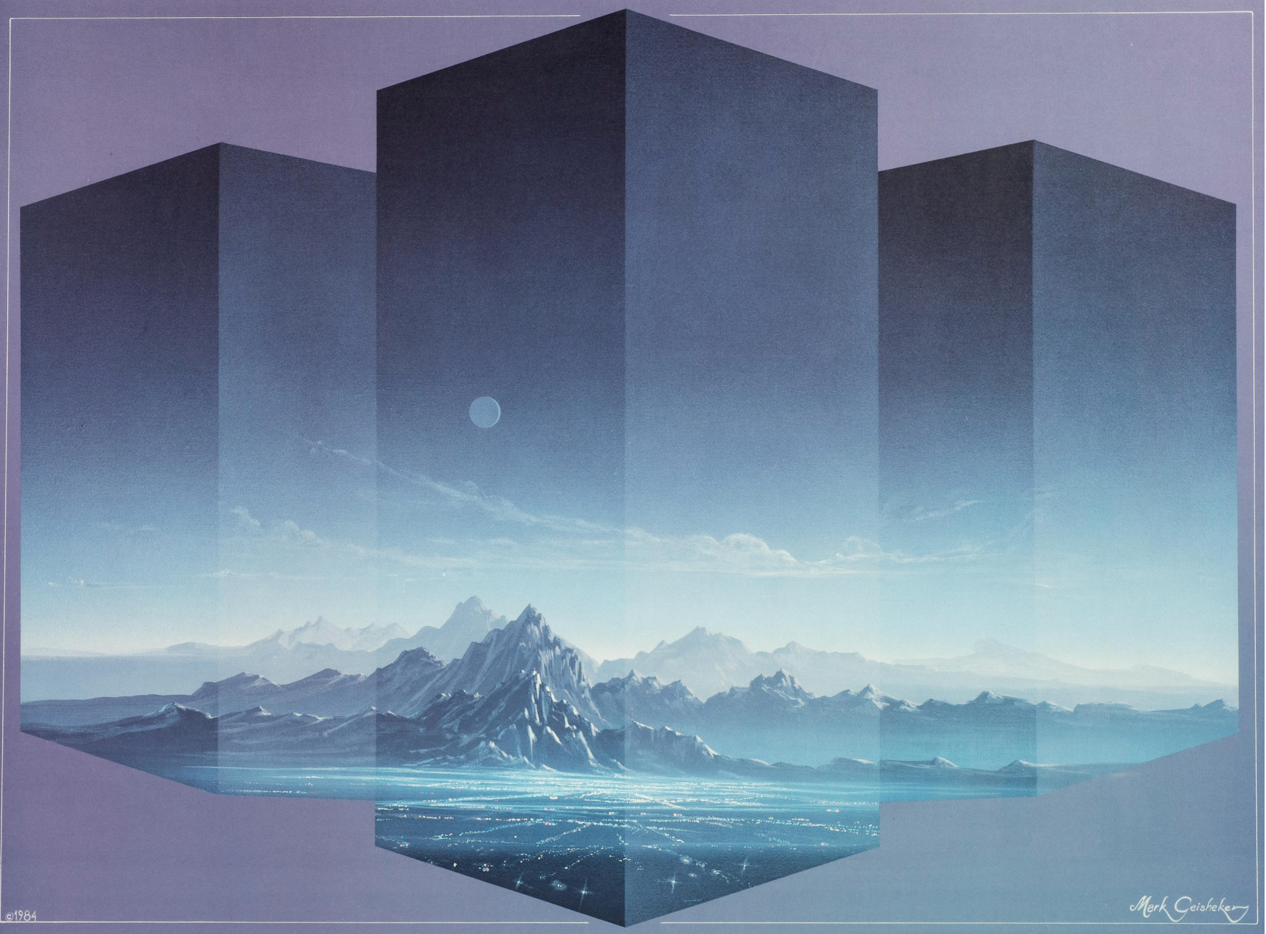 A striking 1980s abstract landscape by Mark Geisheker, this oil on canvas captures the era’s fascination with bold geometry and atmospheric color. Angular mountain forms emerge through cool tones of purple, navy, turquoise, and teal, creating a dreamlike scene that feels both modern and surreal. Signed lower right and dated 1989, this piece is perfect for bringing a touch of 1980s surrealist-inspired style and vibrant retro character into your home