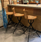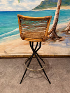 Elevate your home bar or dining experience with this stunning set of Vintage MCM rattan swivel bar stools. These stools feature a woven rattan seat and backrest, beautifully combining comfort and style. The base, crafted from black metal with a crisscross design, adds a unique touch, complemented by a circular chrome footrest for added elegance.
