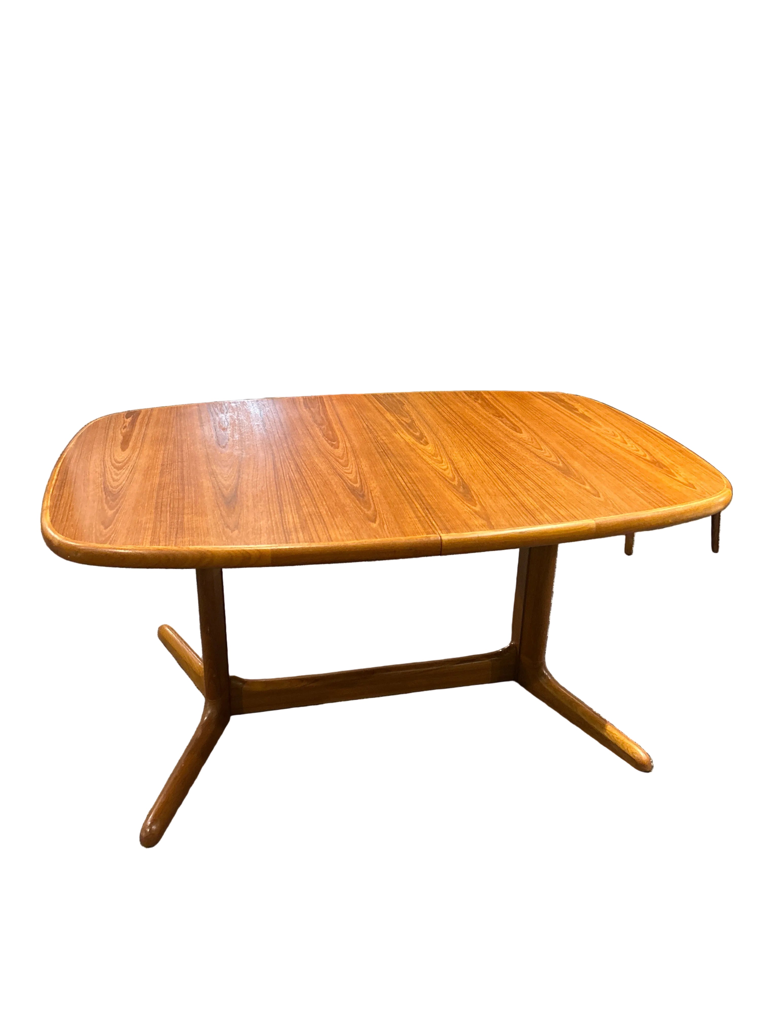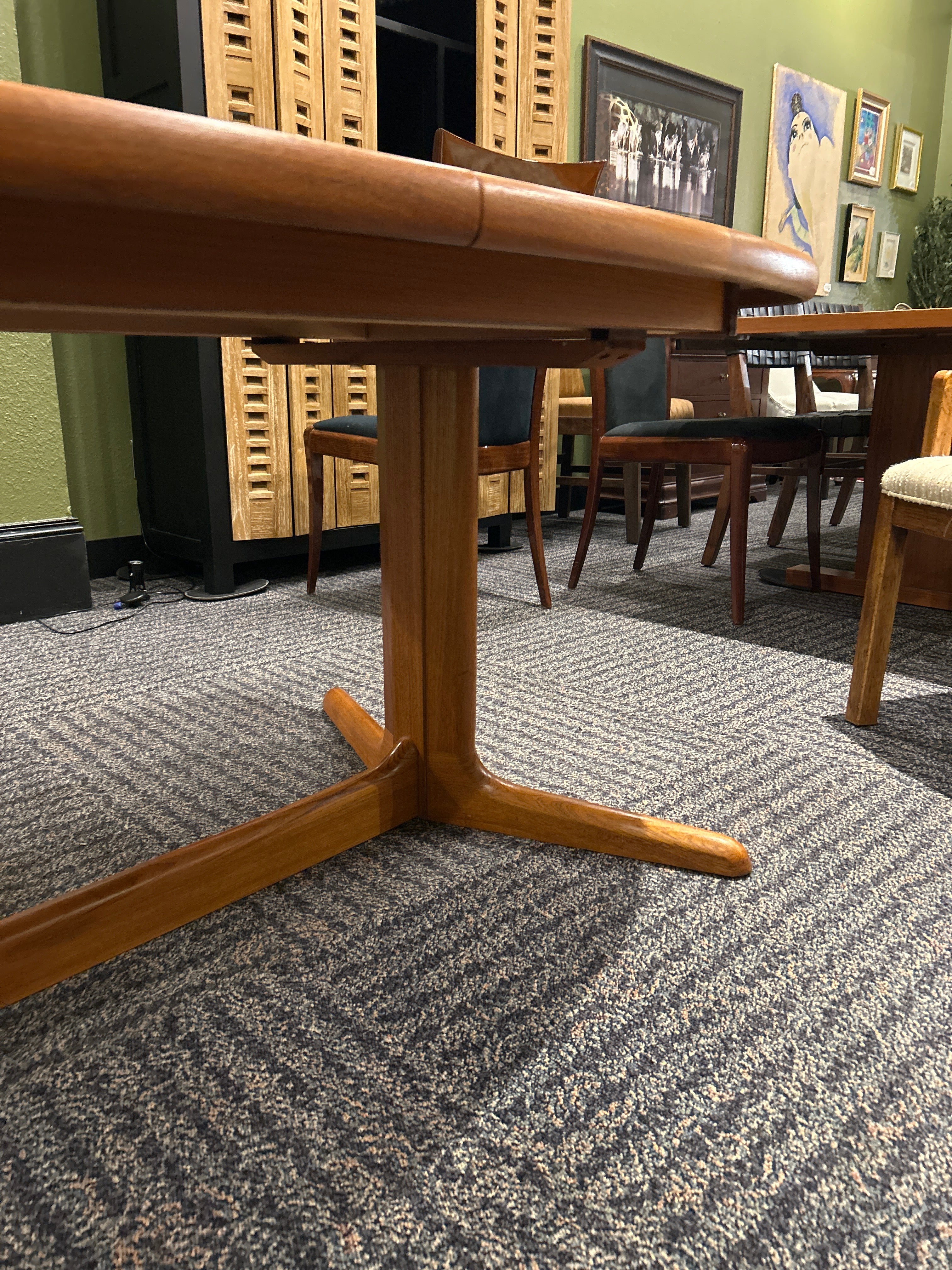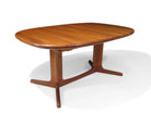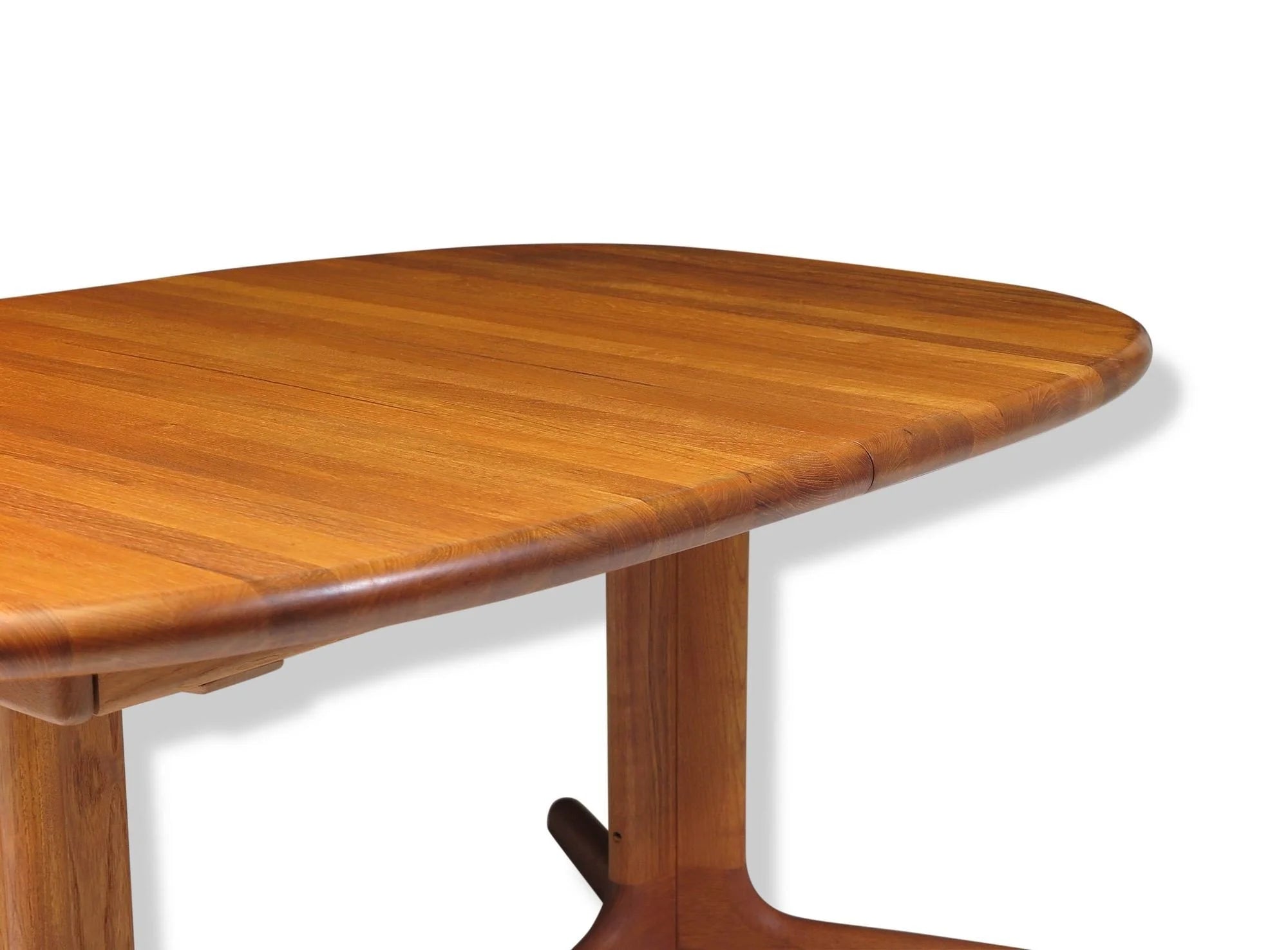 Mid-Century oval solid teak dining table crafted of planks of old-growth teak, with two leaves, raised on a pedestal base. Finely restored by our team of in-house craftspeople. Excellent condition with minor signs of age and use.