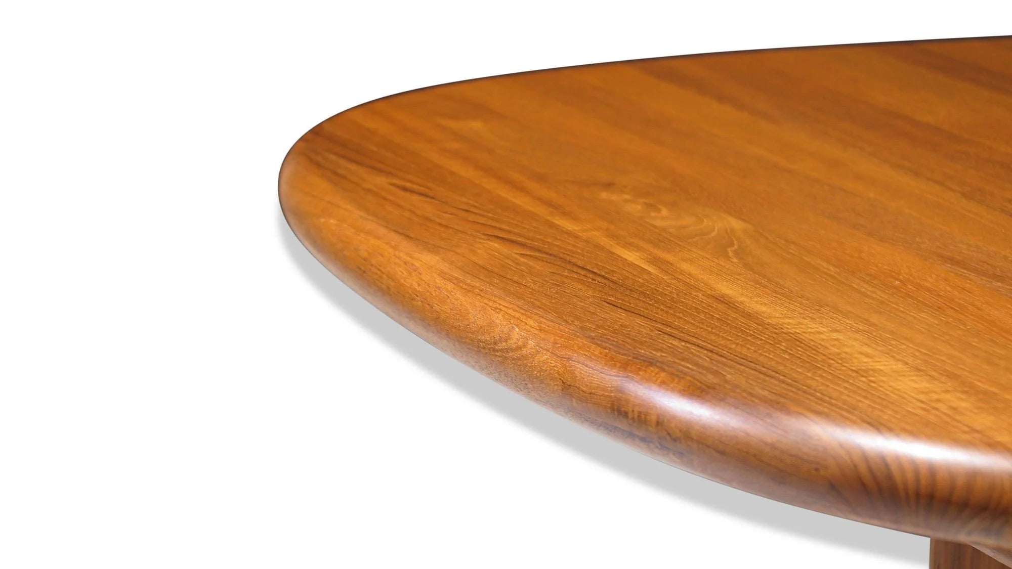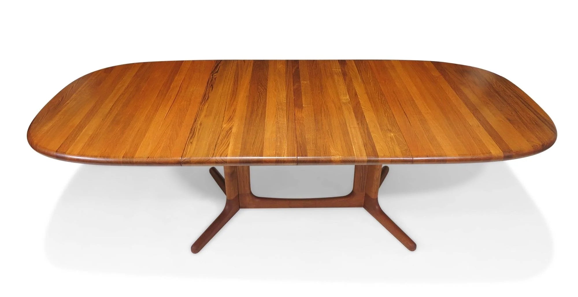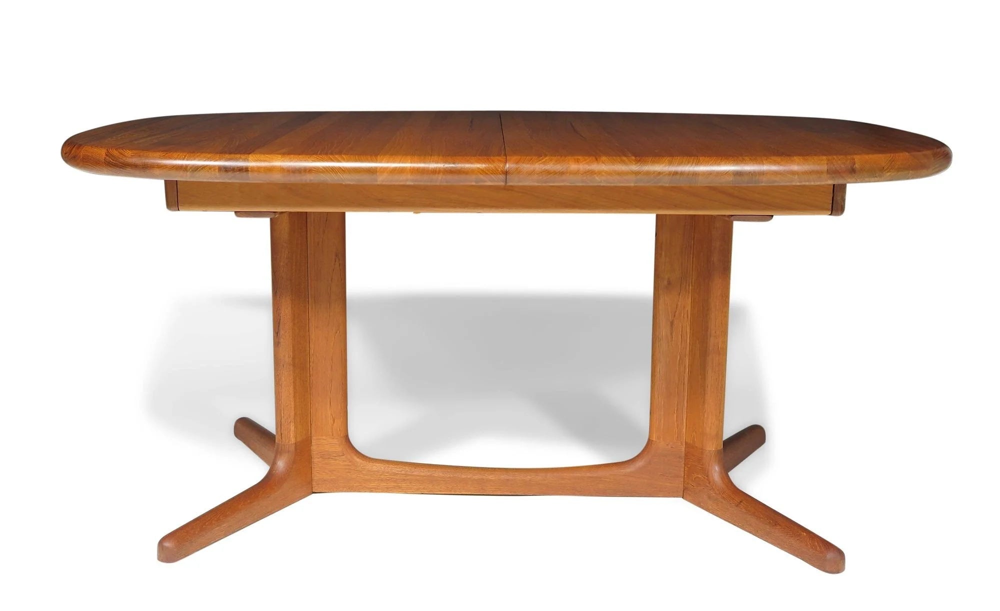 Mid-Century oval solid teak dining table crafted of planks of old-growth teak, with two leaves, raised on a pedestal base. Finely restored by our team of in-house craftspeople. Excellent condition with minor signs of age and use.