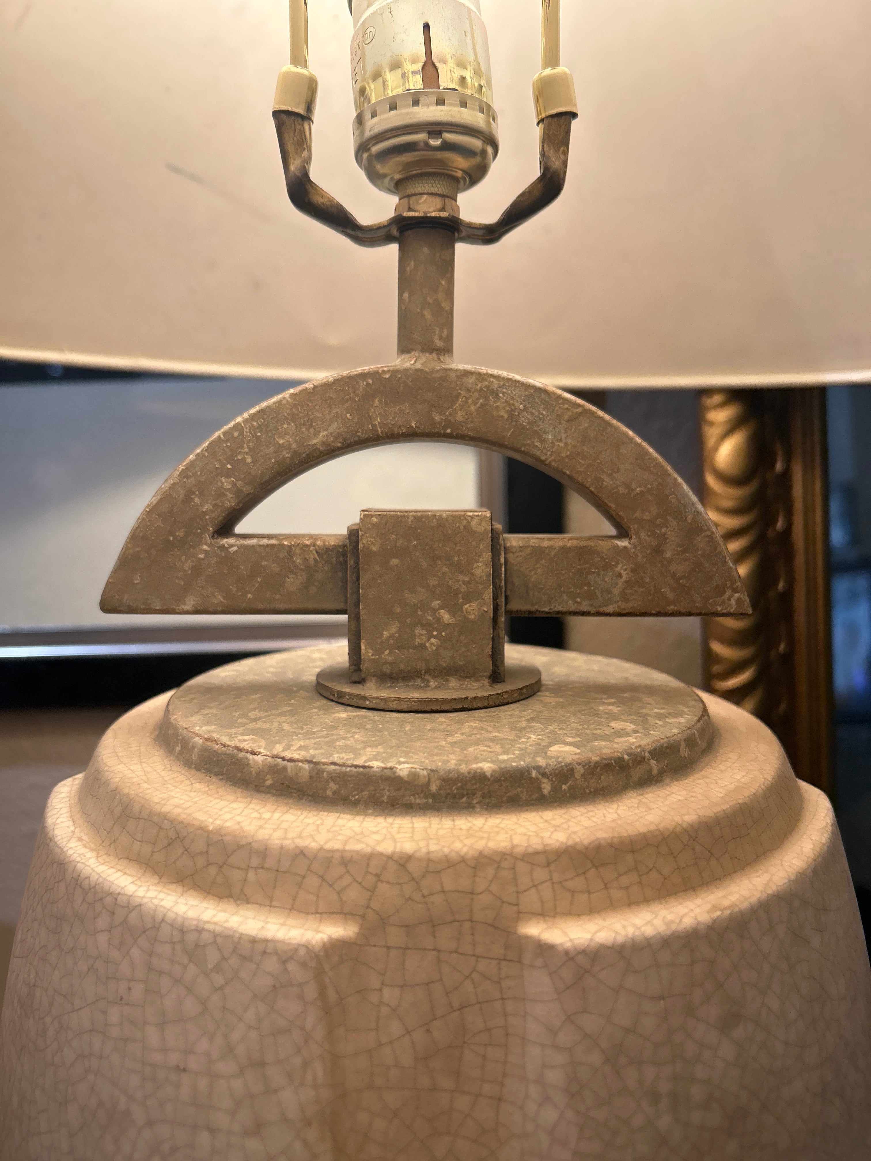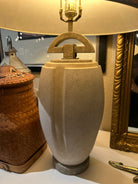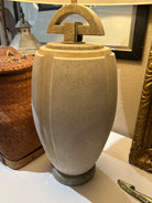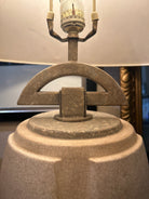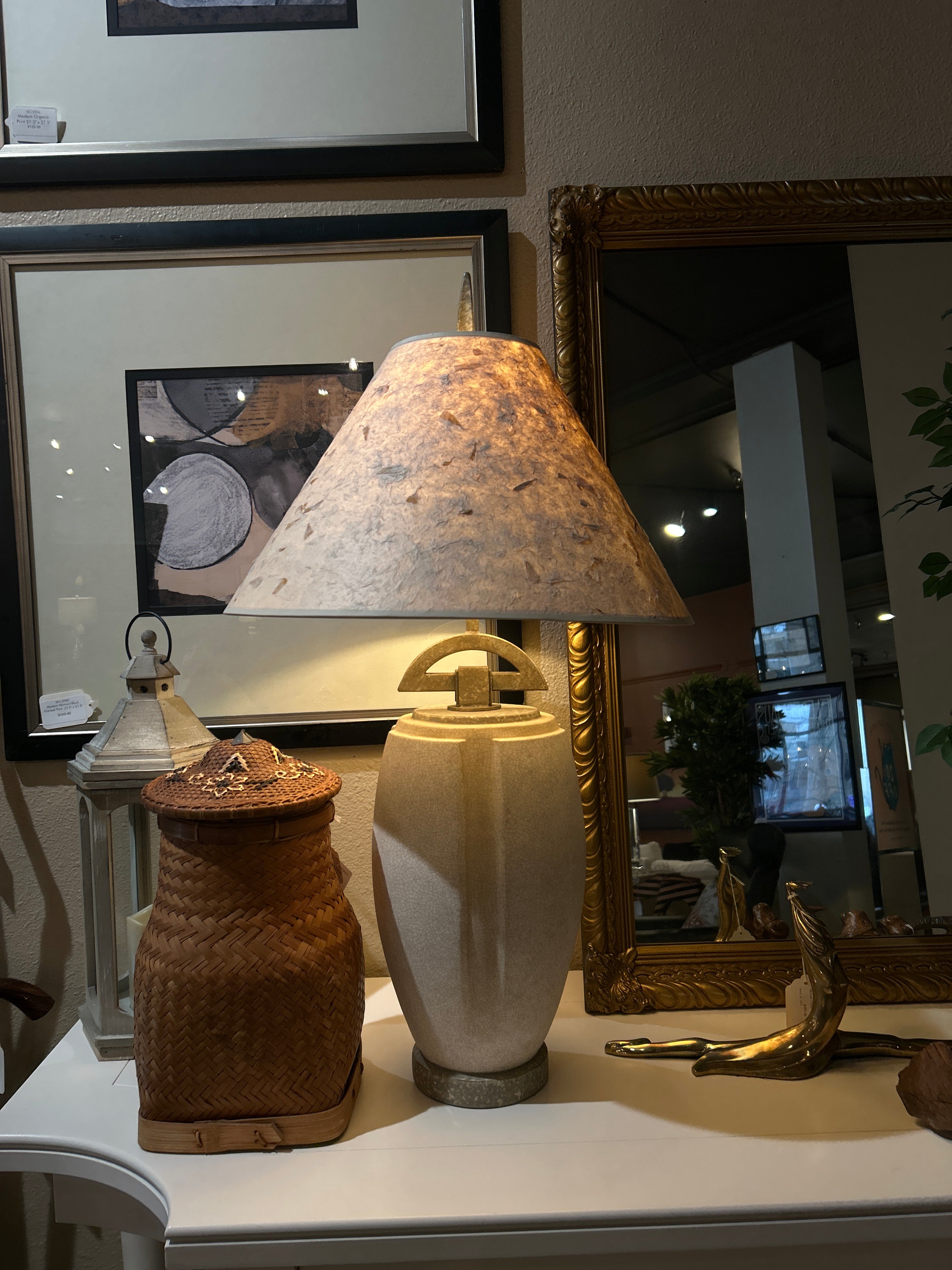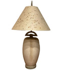 This 30-inch table lamp combines rugged, earthy textures with delicate natural details. The oversized urn-shaped base features a heavily distressed finish that mimics the look of aged stone or carved plaster. Its neutral beige tone allows the deep pits and organic imperfections of the surface to stand out.