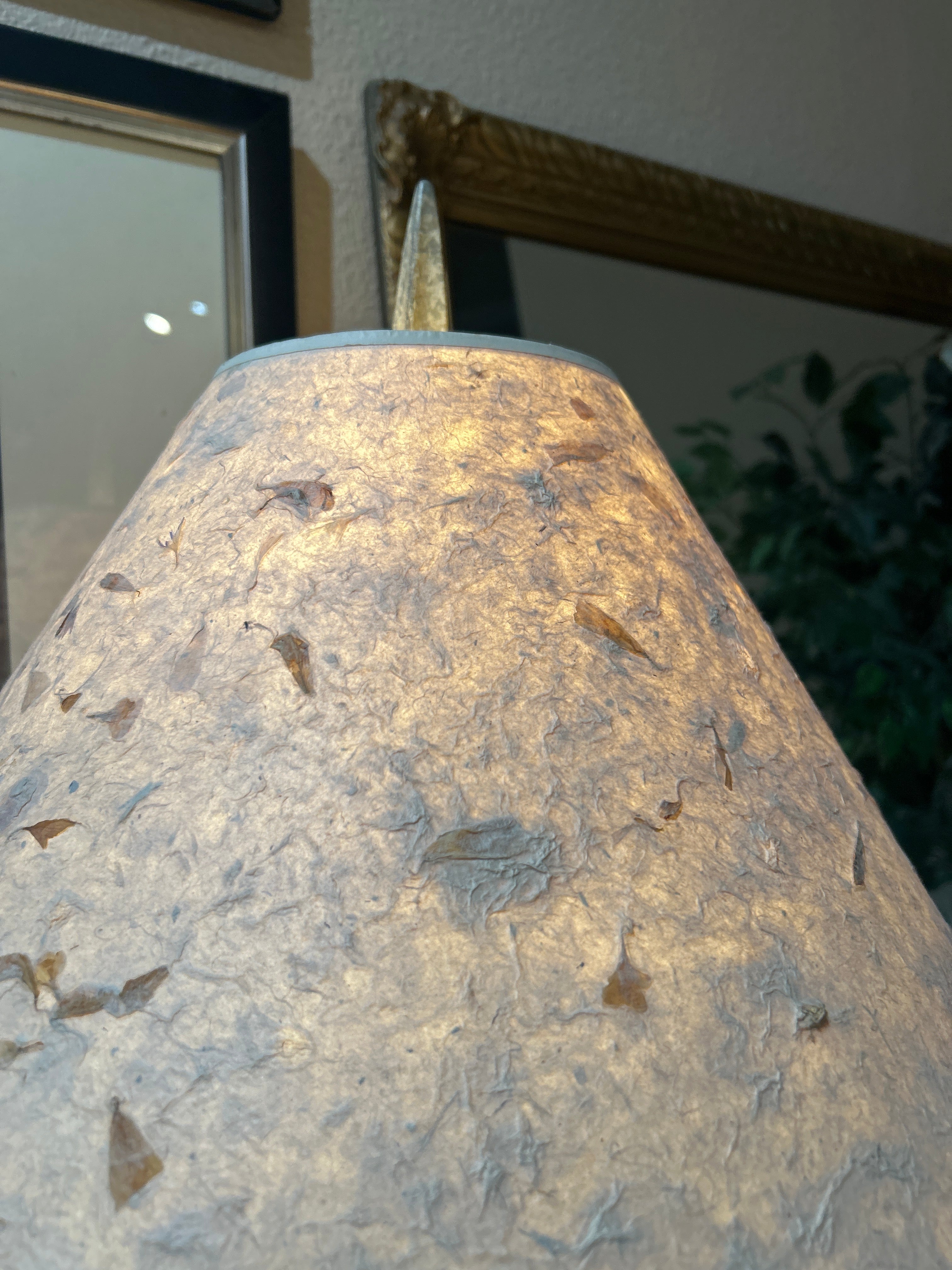 The custom-style tapered shade is the highlight of the piece. It features a warm cream background adorned with a soft botanical pattern of pressed leaves and swaying stems. When turned on, the shade filters light through these natural motifs to create a cozy, dappled glow.