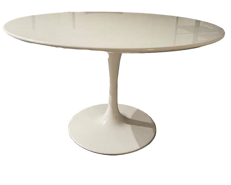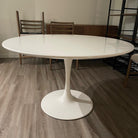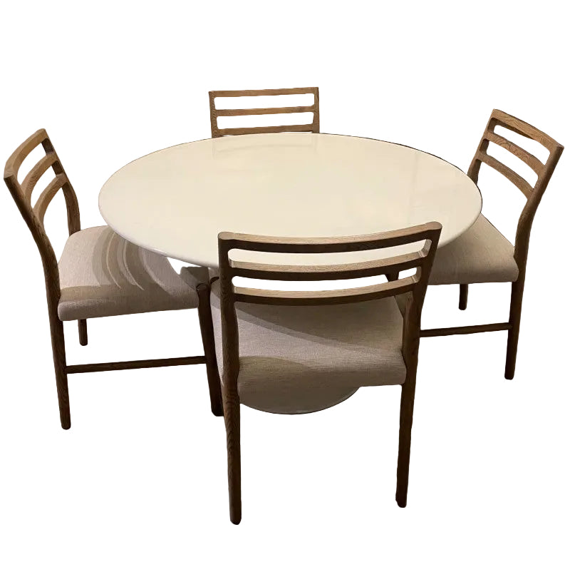 Bring timeless modern style to your dining space with this sleek white Lippa table paired with four Glenmore chairs. Inspired by mid-century design, the Lippa’s iconic pedestal base and smooth lacquered top offer a minimalist silhouette that feels fresh yet classic. The coordinating Glenmore chairs add warmth and texture with their light wood frames and soft neutral cushions.