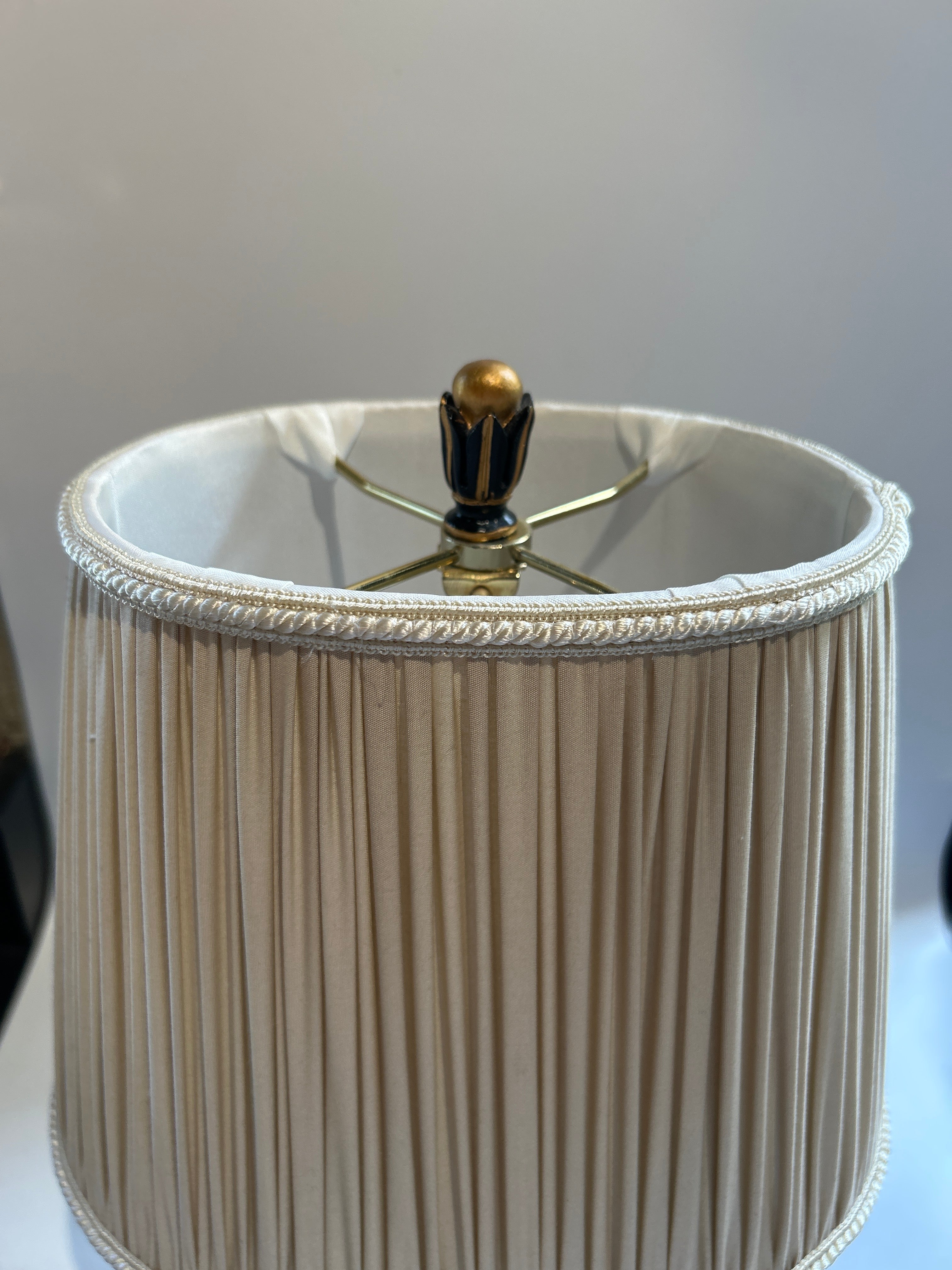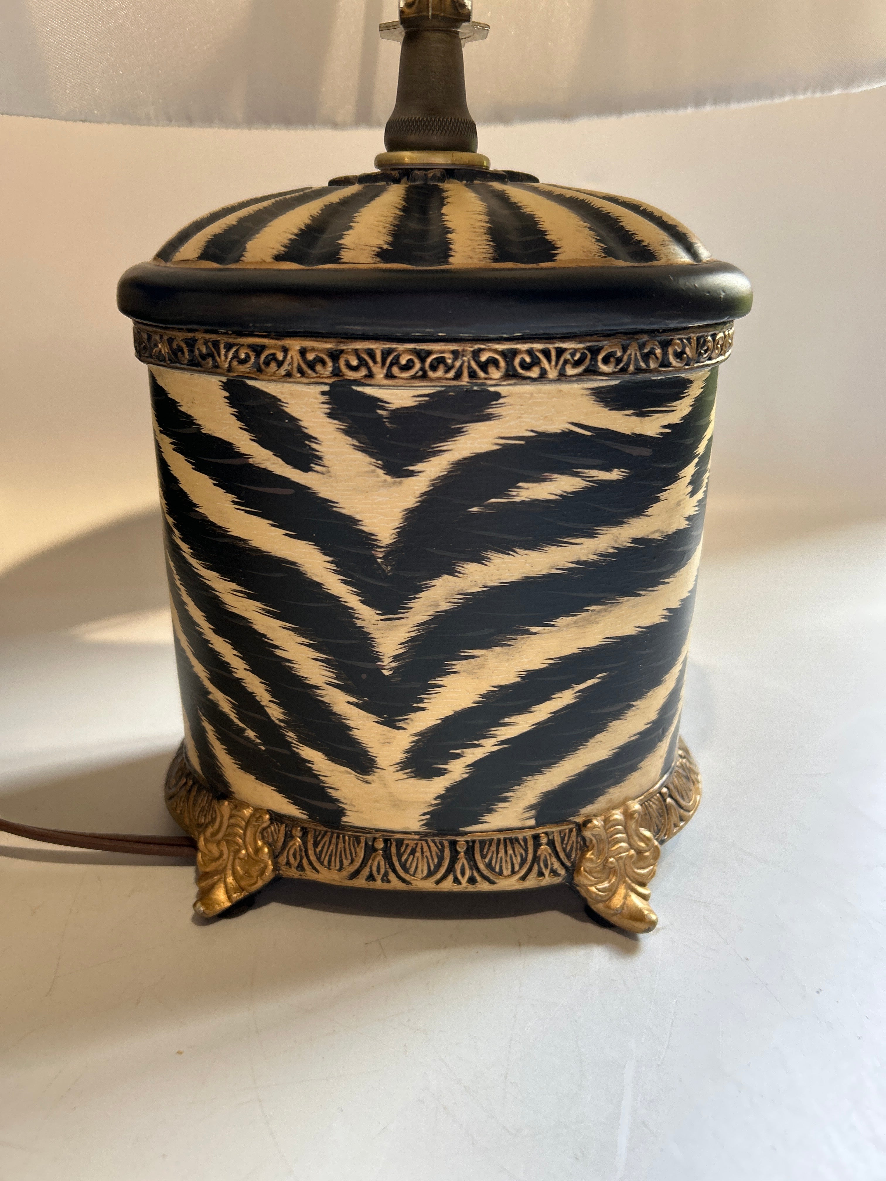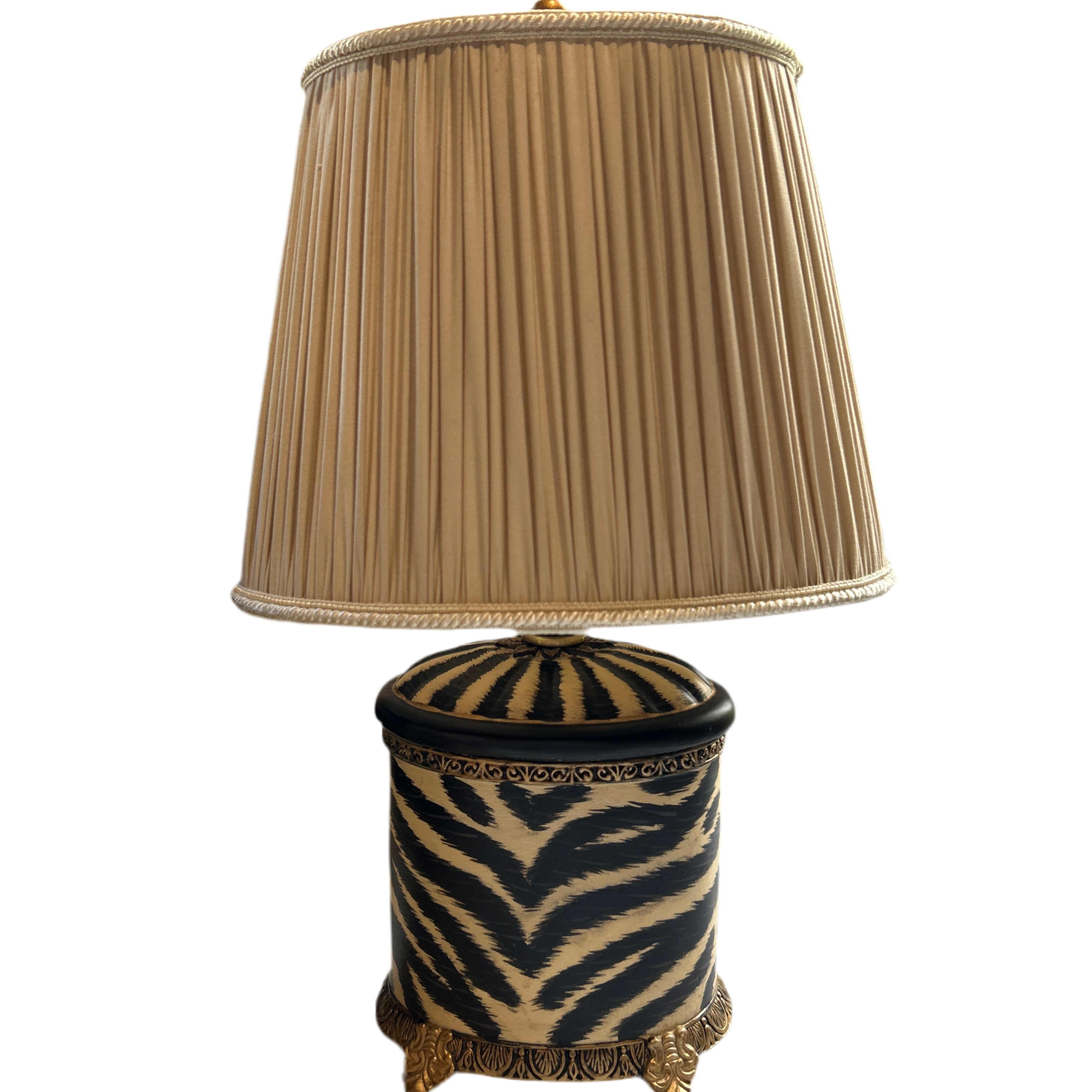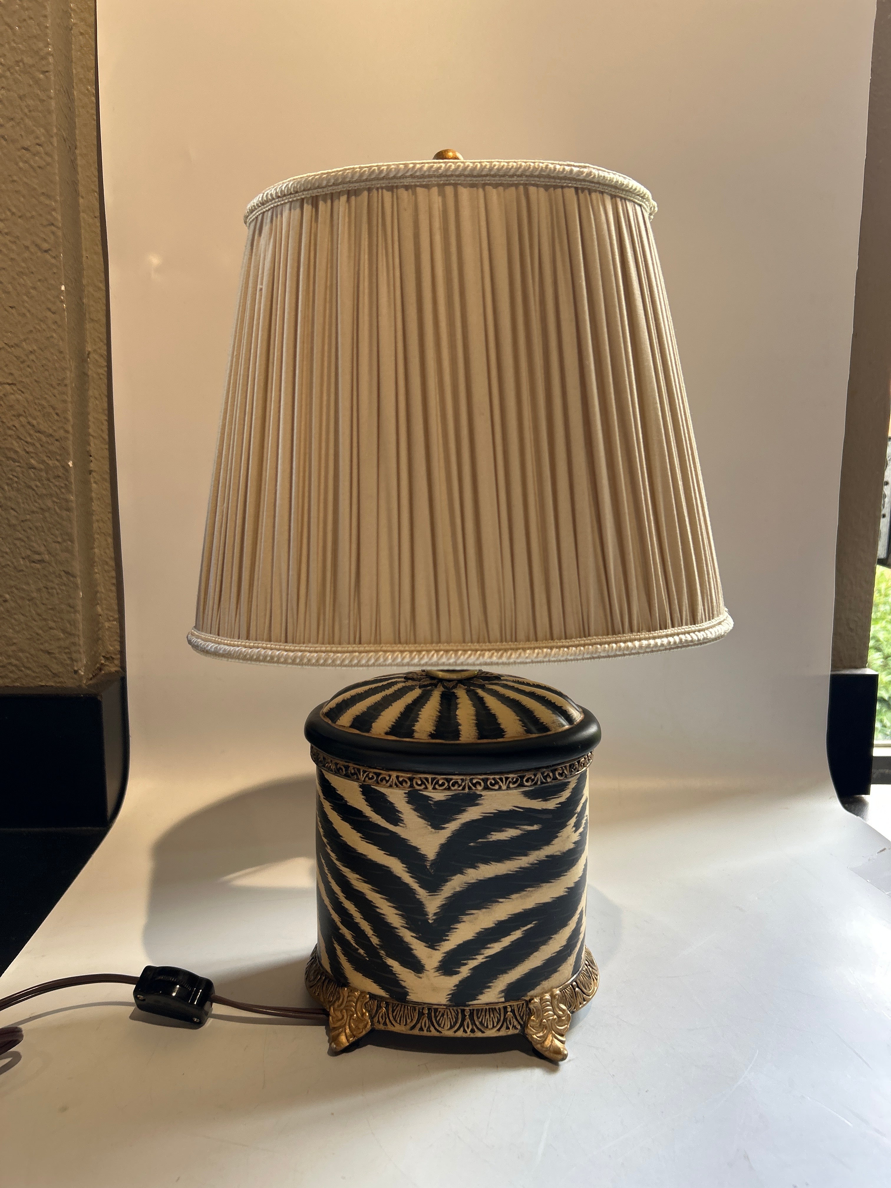 This table lamp features a zebra print base with decorative gold accents and a pleated beige lampshade. It adds a bold, stylish touch to any room's decor.